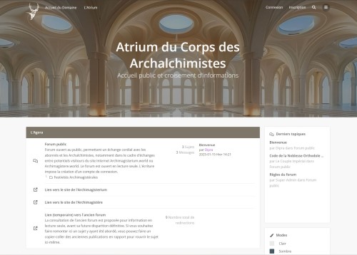 Le site Internet du Corps des Archalchimistes, affilié à celui de l’Archimagisterium, accueille un nouveau forum. Le lieu d’échange public avec les Archalchimistes où peuvent être posées vos questions, où adresser vos remarques ou tout simplement débattre de telle ou autre question, dans la sérénité, le calme et la bienveillance.